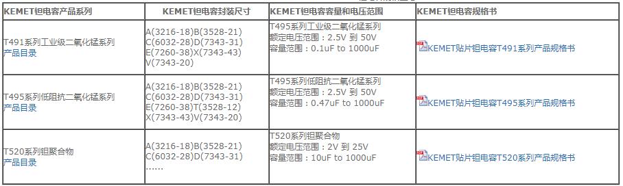 KEMET鉭電容有標準系列、低阻系列、高溫系列、軍工系列等不同系列產品。