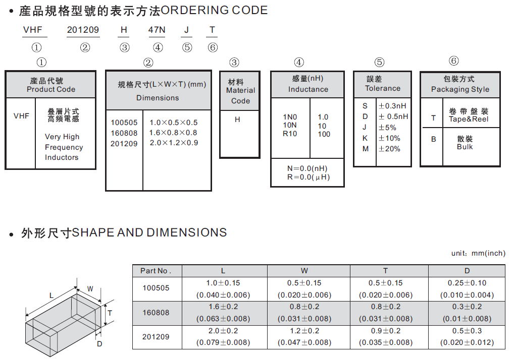 電感公差:S:±0.3nH;D:±0.5nH;J:±5%;K:±10%;M:±20%;