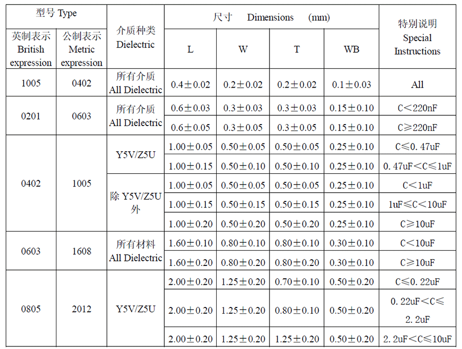 產品封裝:1005/0201/0402/0603/0805/1206/1210/1808/1812/2220/2225/3035