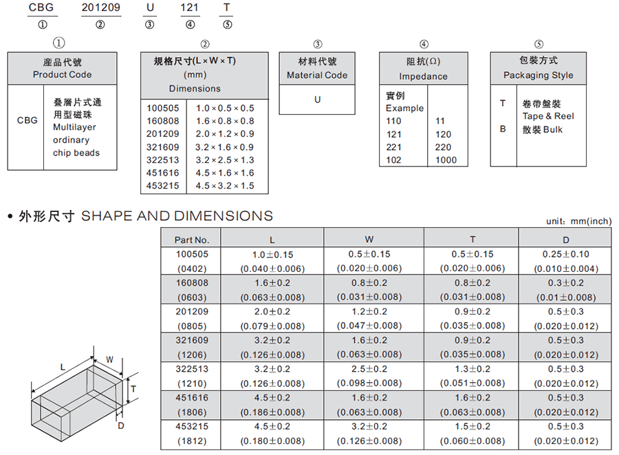 5、磁珠包裝方式:T表示編帶包裝,有時候T會省略不寫,默認均為編帶包裝。B表示散裝。