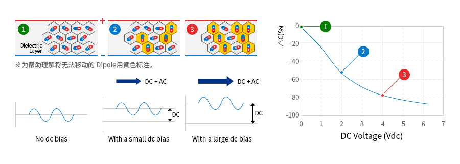像Class2 產(chǎn)品,電介質(zhì)內(nèi)的 Dipole在加 DC 電壓后,會按照電壓所處的方向整齊排列,當所加的 DC 電壓變大,因 DC 電壓而固定方向的 Dipole也會增加。MLCC的容量由對 AC 電壓做出反應的 Dipole決定,由DC 電壓固定的 Dipole越多對 AC 電壓做出反應的 Dipole 就會越少,從而導致容量下降。