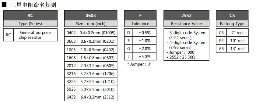 三星貼片電阻規格對照表